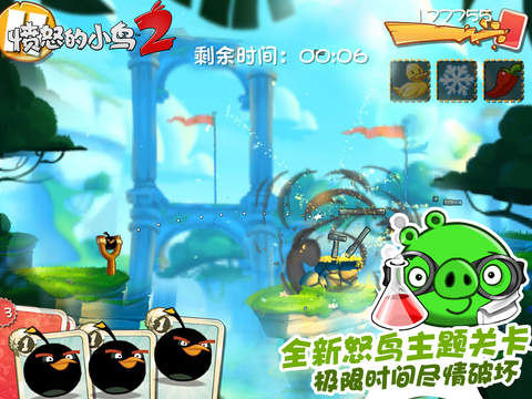 全新小鸟“炫舞银”闪亮登场!银鸟会利用空中旋转然后垂直下落的飞行方式产生强大的冲击力,尤其擅长对付那些藏在建筑物里面的猪们。而在战斗中鸟的出战顺序不再是固定的,玩家可以随机选择鸟进行攻击,从而实现自己不同的攻击策略。填满破坏蓄力计,还可以额外获得小鸟!