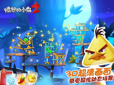 《愤怒的小鸟2》充分发挥了3D引擎的优势,融入了动态场景树摇花摆、风云雷电、特殊光影。猪猪岛上从未有过如此惊艳的场面,让玩家体验身临其境的感觉。新增暴风雪、辣椒、金色鸭鸭及其它酷炫的魔法,助您一臂之力对抗猪猪!